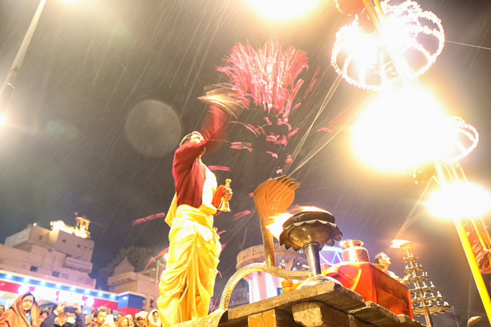 You can take a boat from Dashashwamedh Ghat and cross the river to go to the other side. The sunset over the century-old buildings on the ghats of Varanasi looks spectacular from the other bank of Ganges, especially the way the last orange hue of the sky disappears gradually making the outline of the ghats and the buildings hazy and obscure until the street lights lit up and enlighten some of the ghats again. By then, you should go back to the Dashashwamedh Ghat to join the final attraction of the day.