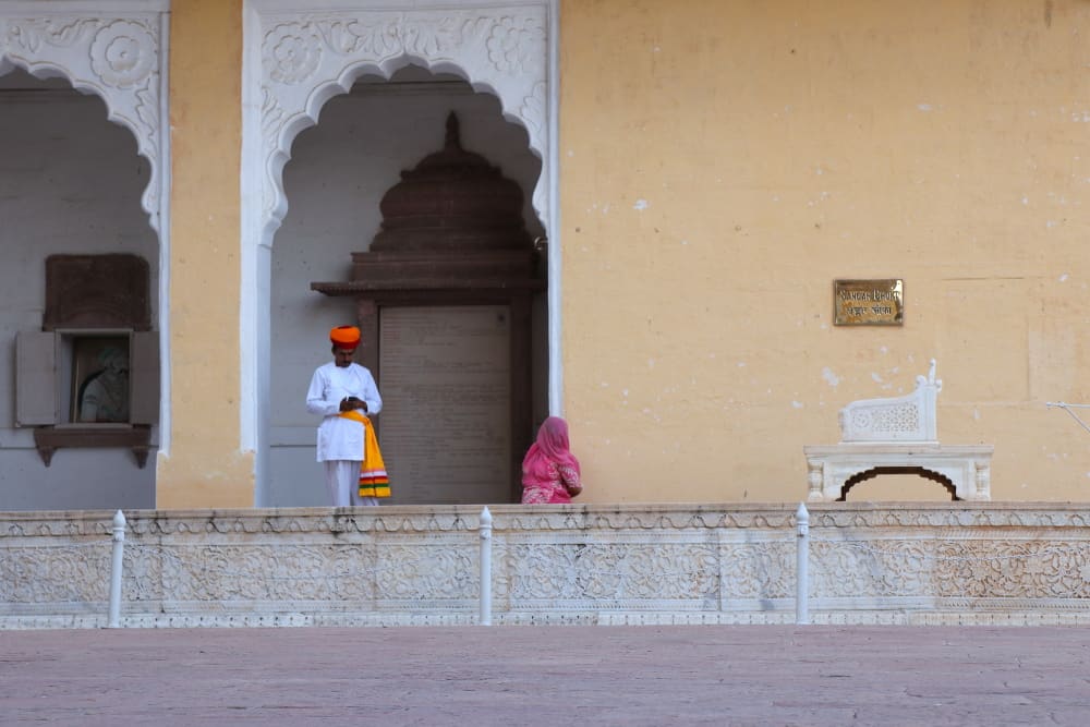 Finally, turning through Loha Pol will make you enter the main courtyard – The Shringar Chowk. The moment you reach Shingar Chowk, you will be surrounded by buildings and palaces all around. A chair made of marble rock is in one corner, which was used for the coronation of a new king. And then there are many doorways around. You will also notice Rajput men with long moustaches and in traditional Rajasthani dresses demonstrating how to tie a turban.
