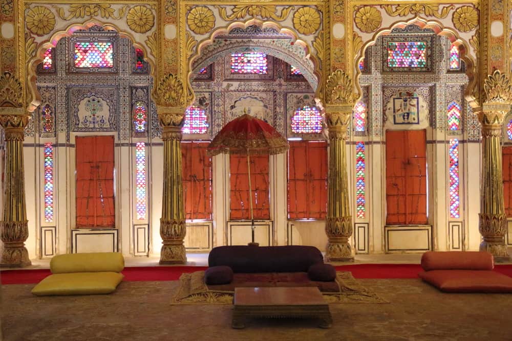 Sheesh Mahal, or Palace of Mirrors, was used as the bedroom of Maharaja Ajit Singh. It is decorated with wonderful glasswork on the roof and over the walls. There is a gesso panel of paintings of the Hindu gods and goddesses just beneath the roof’s arches. The wooden ceiling and the European glass chandler on it are a later addition after the original one collapsed, which can be seen lying on the floor.